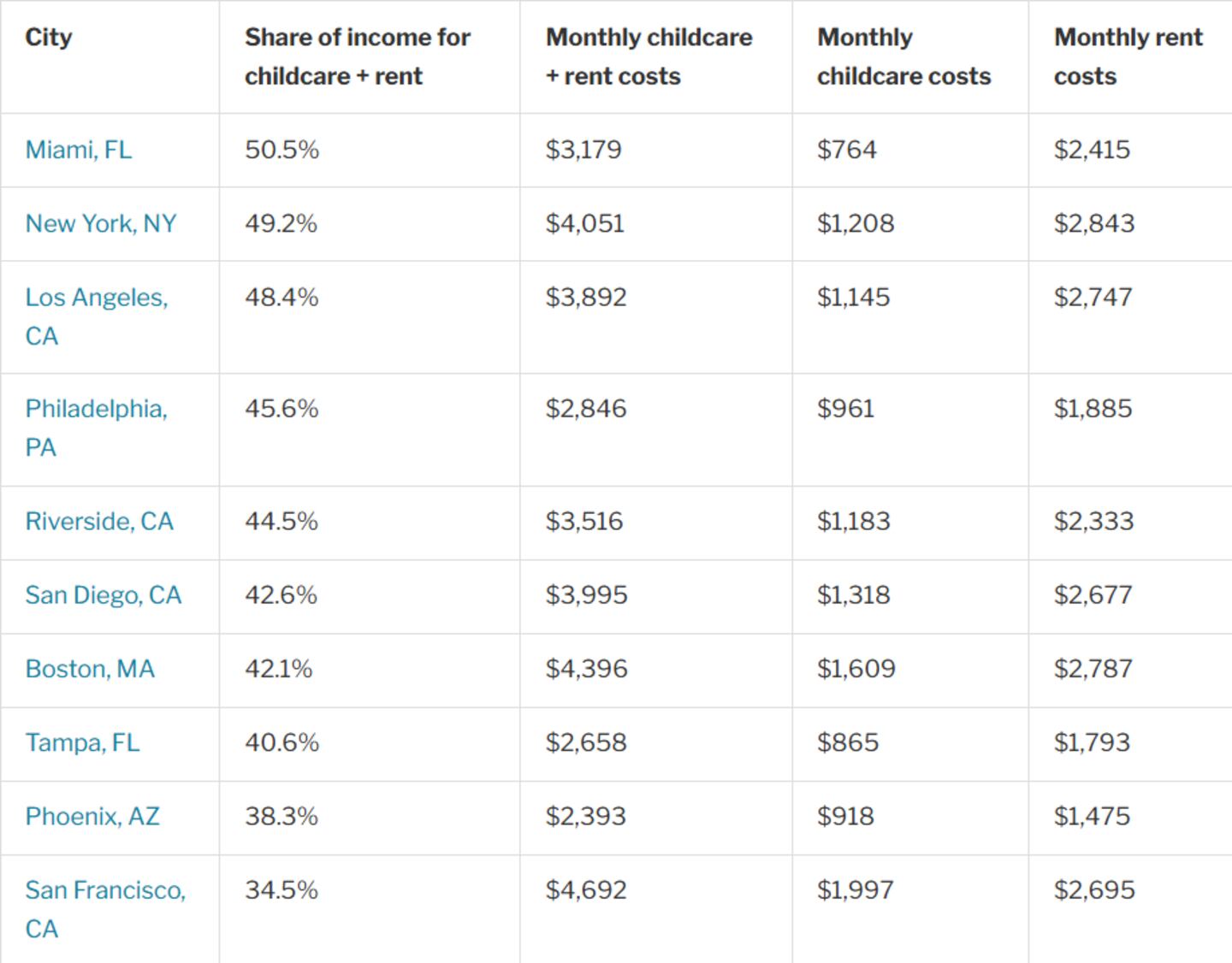 - Average monthly childcare + rent costs: $3,154 ($1,434 + $1,720)