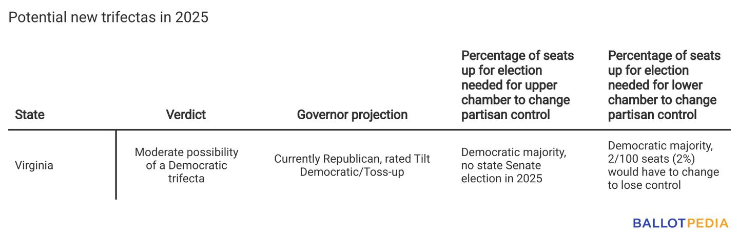New Jersey's Democratic state government trifecta is somewhat vulnerable in 2025, and a new Democratic trifecta in Virginia is a moderate possibility according to Ballotpedia's 2025 trifecta vulnerability ratings.