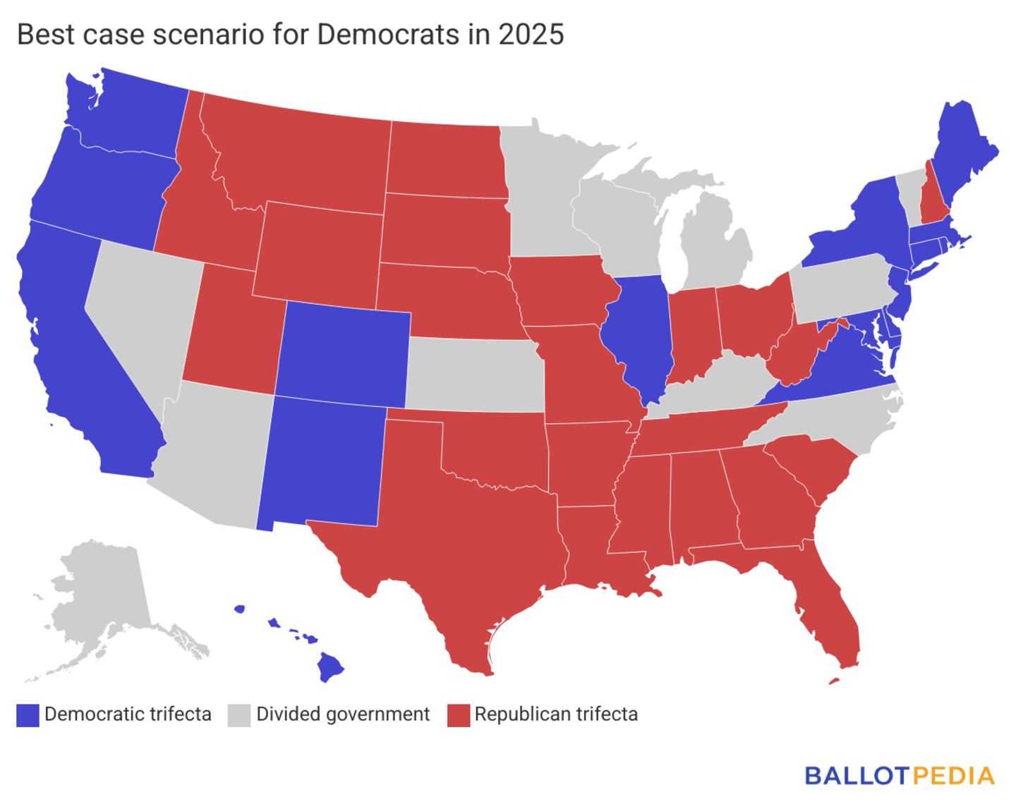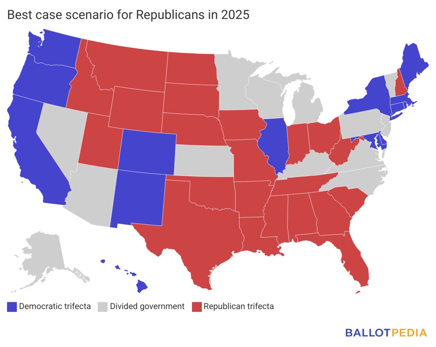 The Republicans' best-case scenario is to break the Democratic trifecta in New Jersey and prevent a Democratic trifecta in Virginia. Because both states' upper chambers are controlled by Democrats and are not up for election, Republicans can not gain any trifectas.