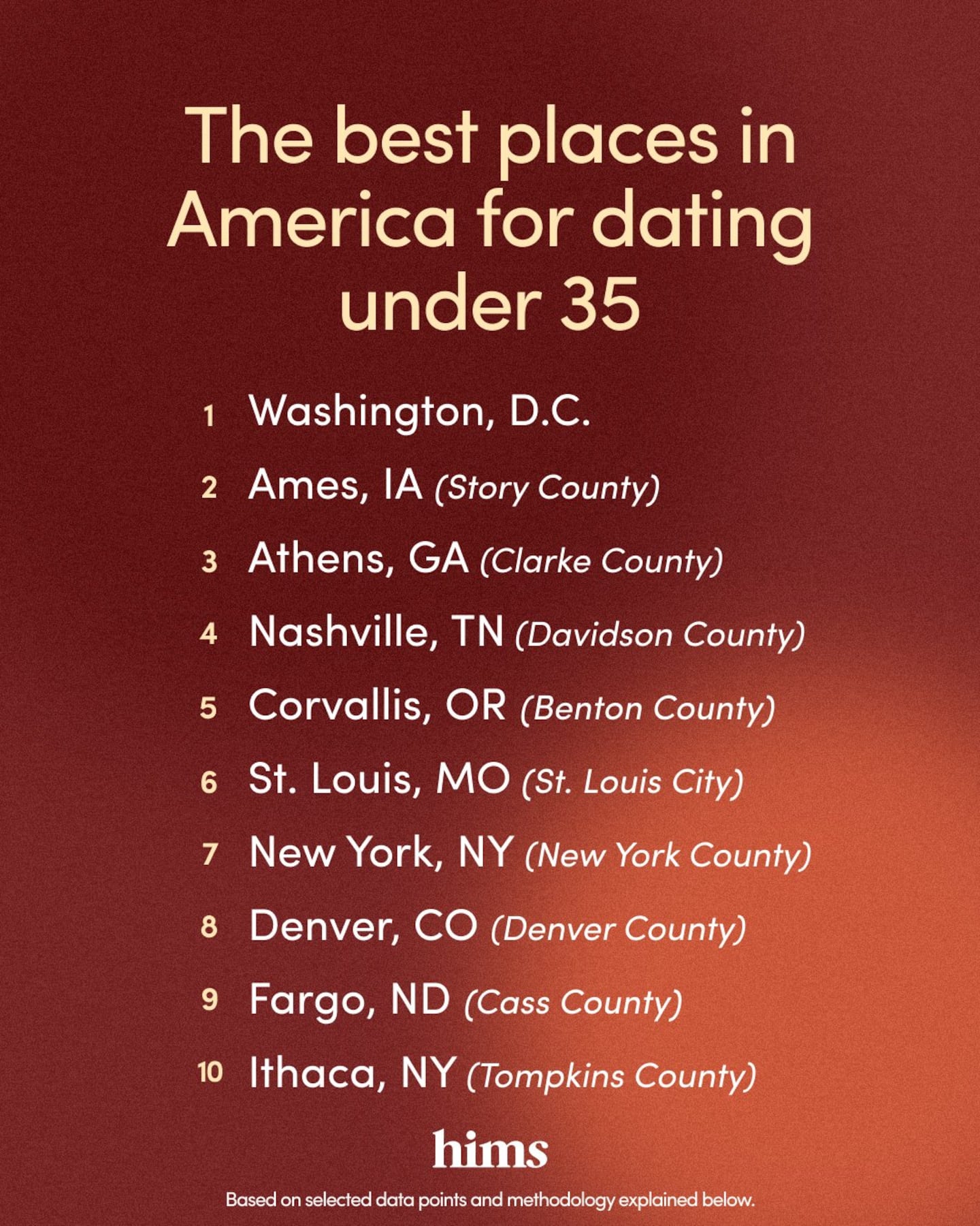To rank the top counties for dating under the age of 35, Hims looked at every county in the U.S. and its proximity to Census-designated metropolitan areas. Counties were the focus of this report because the Census does not provide this data by specific city. For the list of 25 cities, the report pulled out the largest city within close proximity of a particular county, and removed duplicate cities from the final ranking. A point system was then applied to each of the four criteria to calculate a final score for each county. Those with the most points were ranked at the top of the list:
