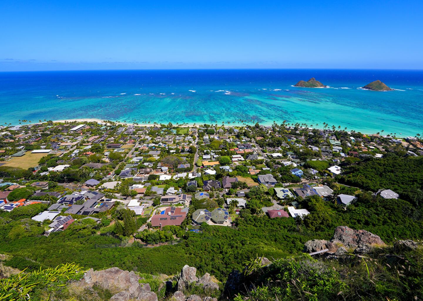 Kailua, on Oahu's windward side, is a quiet, family-oriented beach town about 20 minutes northeast of Honolulu. It offers three spectacular beaches, access to Kawainui Marsh Wildlife Sanctuary, and challenging hiking at Mount Olomana. The town center features a collection of public art and a weekly farmers' market.