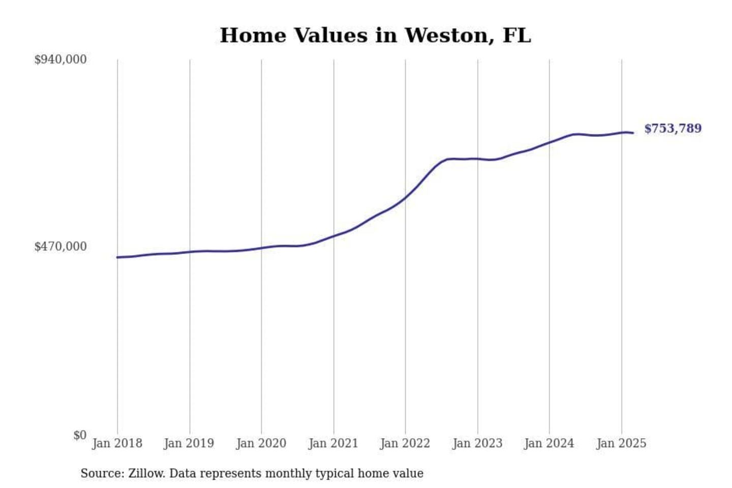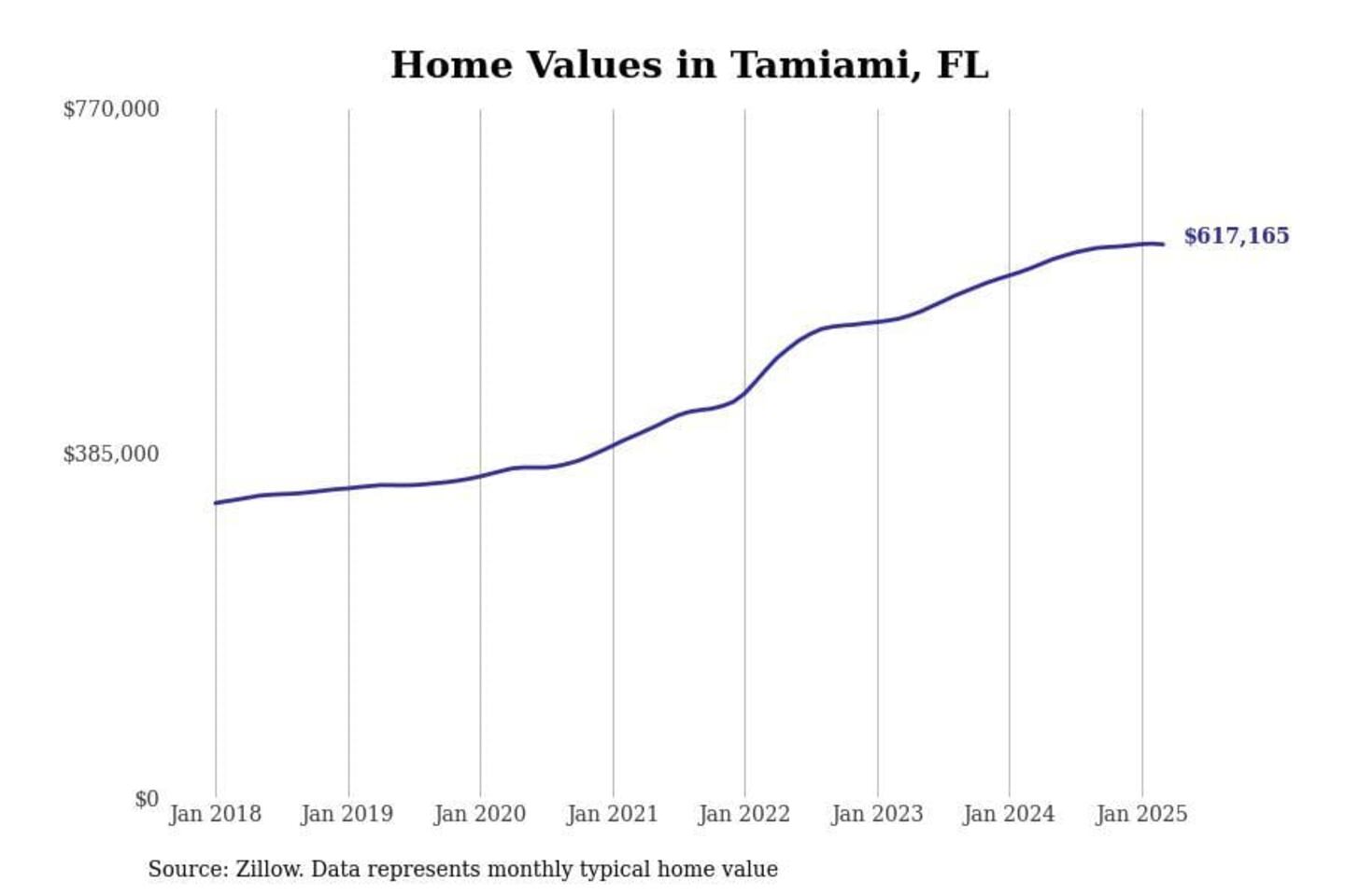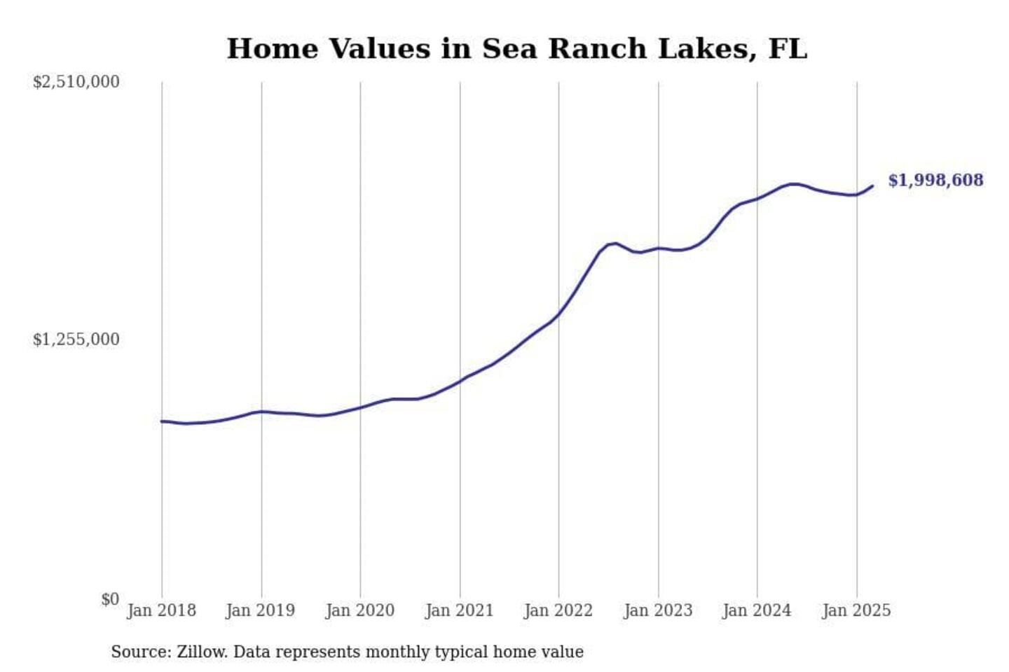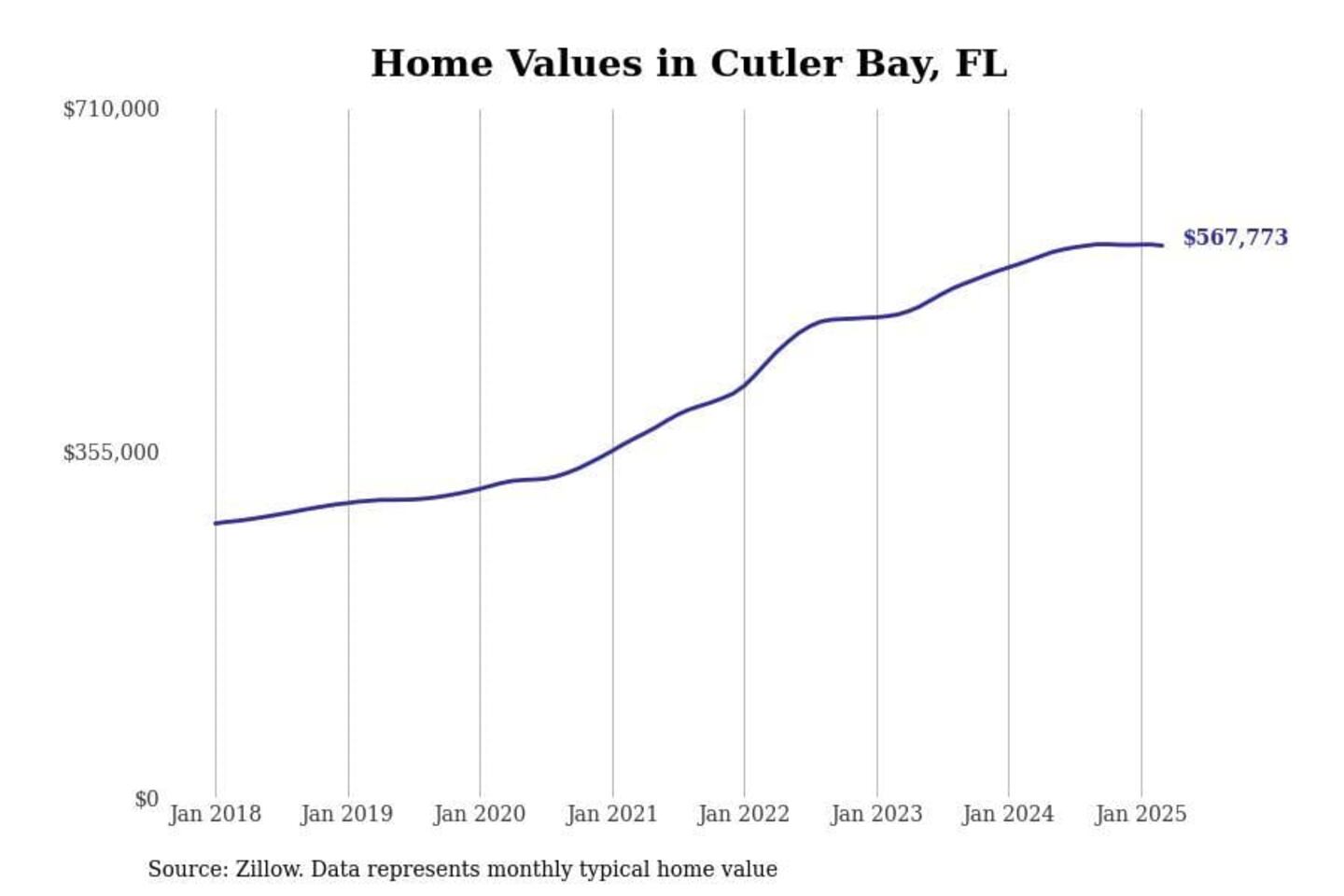 Stacker compiled a list of cities with the fastest-growing home prices in Florida using data from Zillow. Cities are ranked by the dollar change in the Zillow Home Values Index for all homes from the 12 months ending March 2025. The charts in this story were created automatically using Matplotlib. Data was available for 50 cities and towns in Florida.