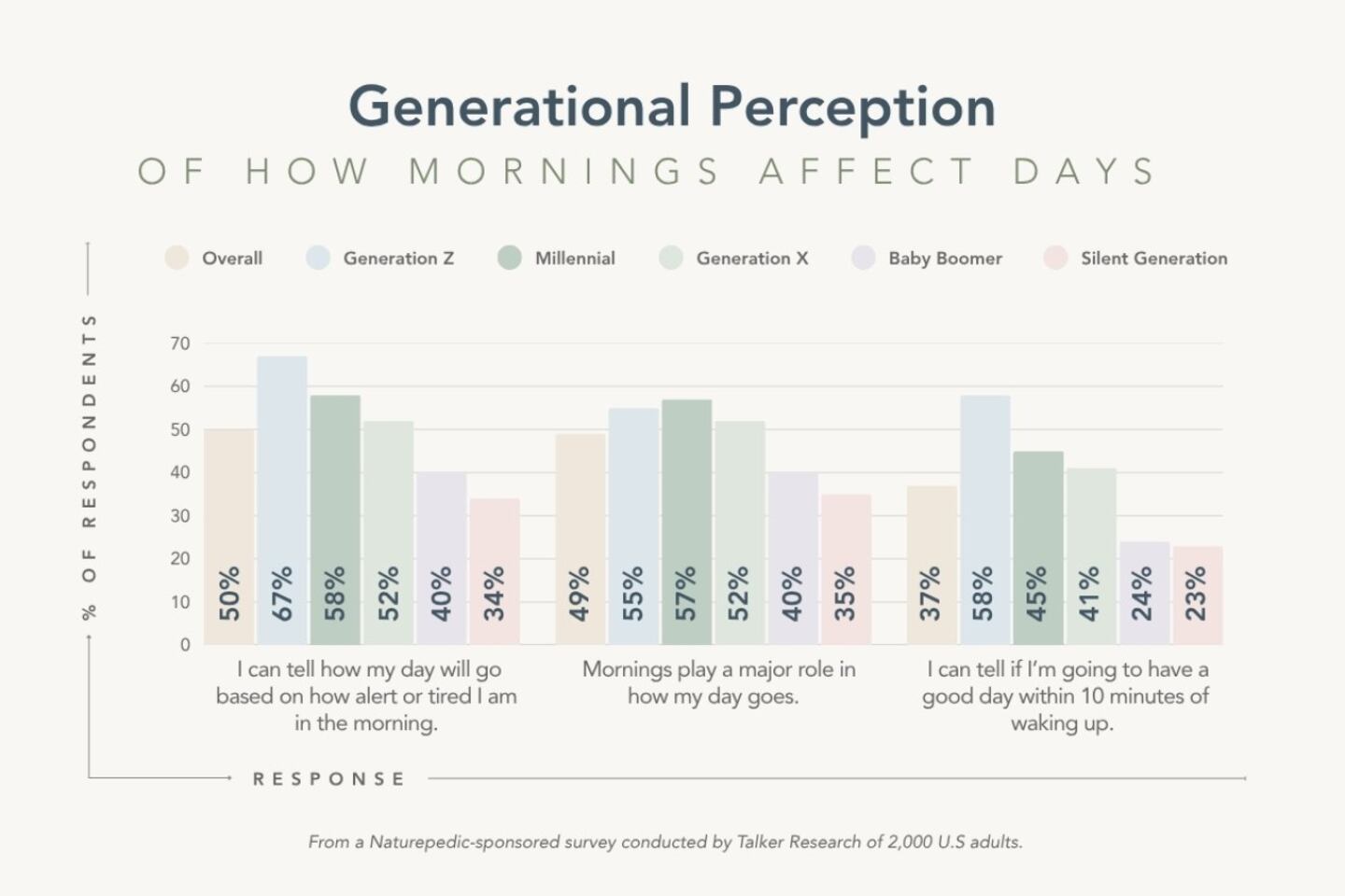 How much does your morning routine impact the rest of your day? Naturepedic teamed up with leading consumer insights and data firm Talker Research to find out — and the results might make you rethink hitting snooze. In fact, 37% of Americans say they can tell how their day will go within the first 10 minutes of waking up.