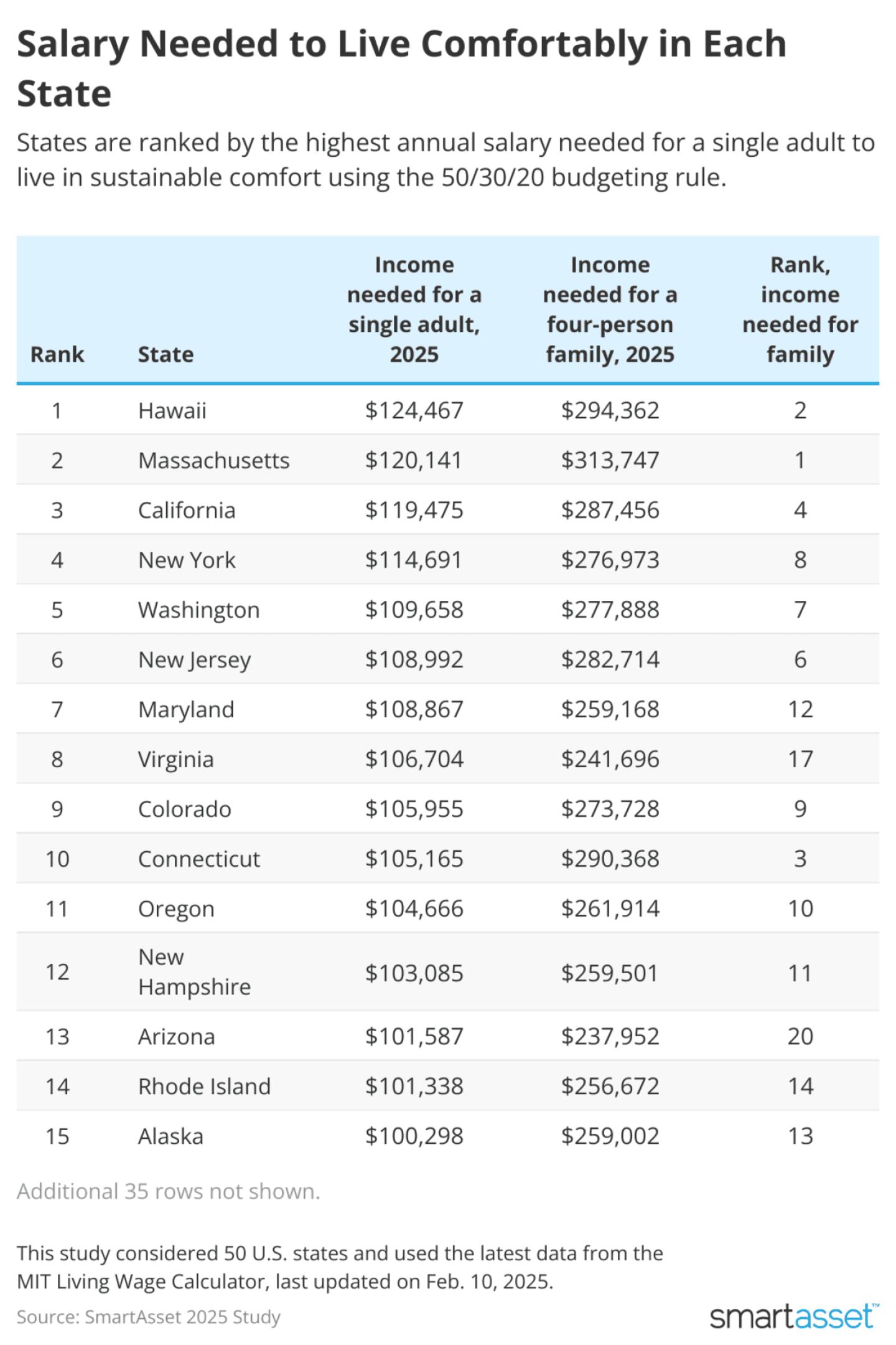 States are ranked based on the salary needed for a single adult with no children.