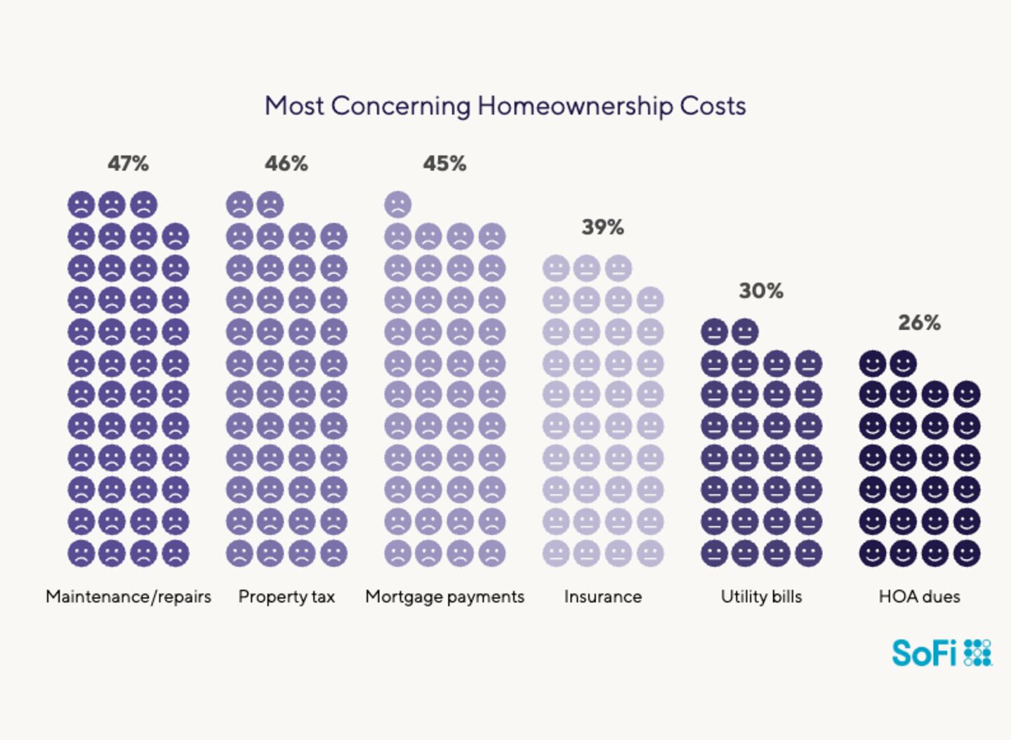 The survey suggests that buyers will continue to employ saving strategies after they close on a property, as ongoing homeownership costs were a significant concern for many respondents. Top worries included maintenance and repairs (a concern for 47%), followed by property taxes (46%), making mortgage payments (45%), affording home insurance (39%), and covering utilities costs (30%). One in four people said homeowners association costs were a concern. In fact, about 30% of U.S. housing stock is in a community governed by an HOA, according to NAR.