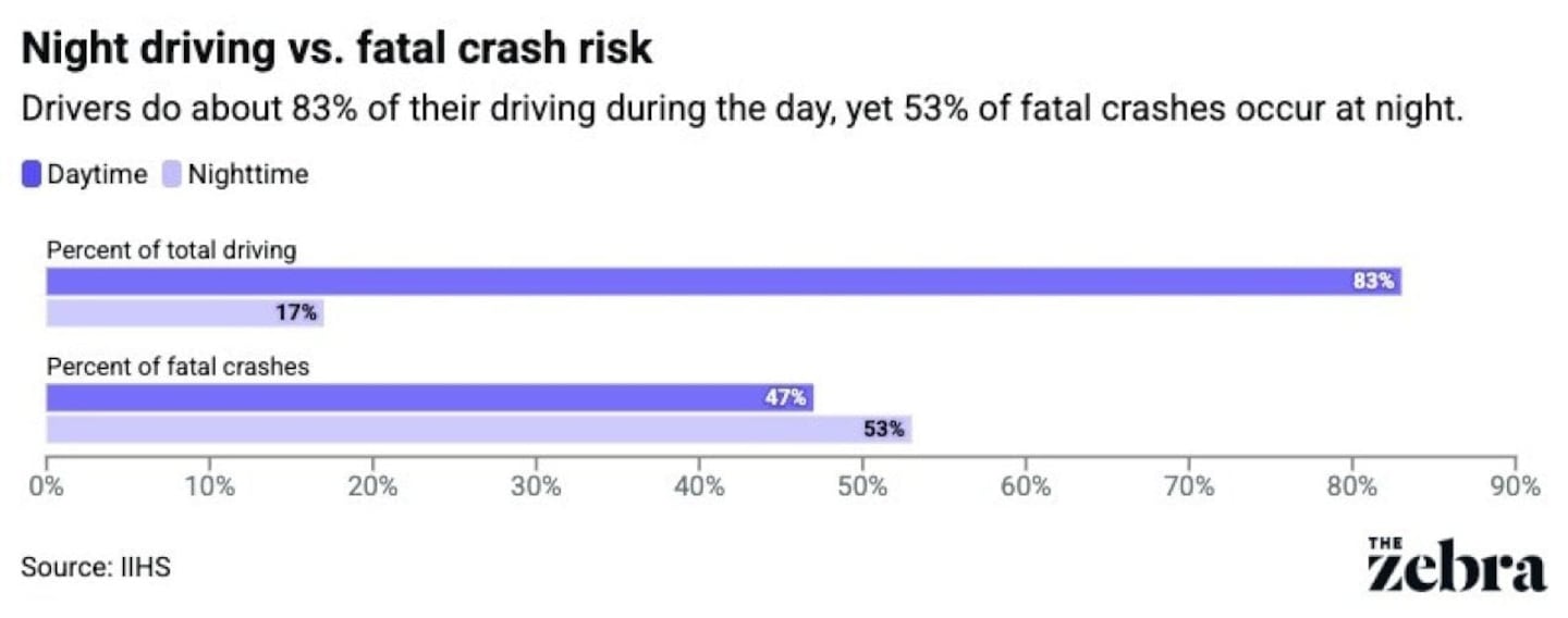In this article, TheZebra explores the ins and outs of this important question. Although only 25% of driving occurs after dark, half of traffic fatalities happen at night, per the National Safety Council, and you are about three times more likely to be involved in a fatal accident at night than during the day.