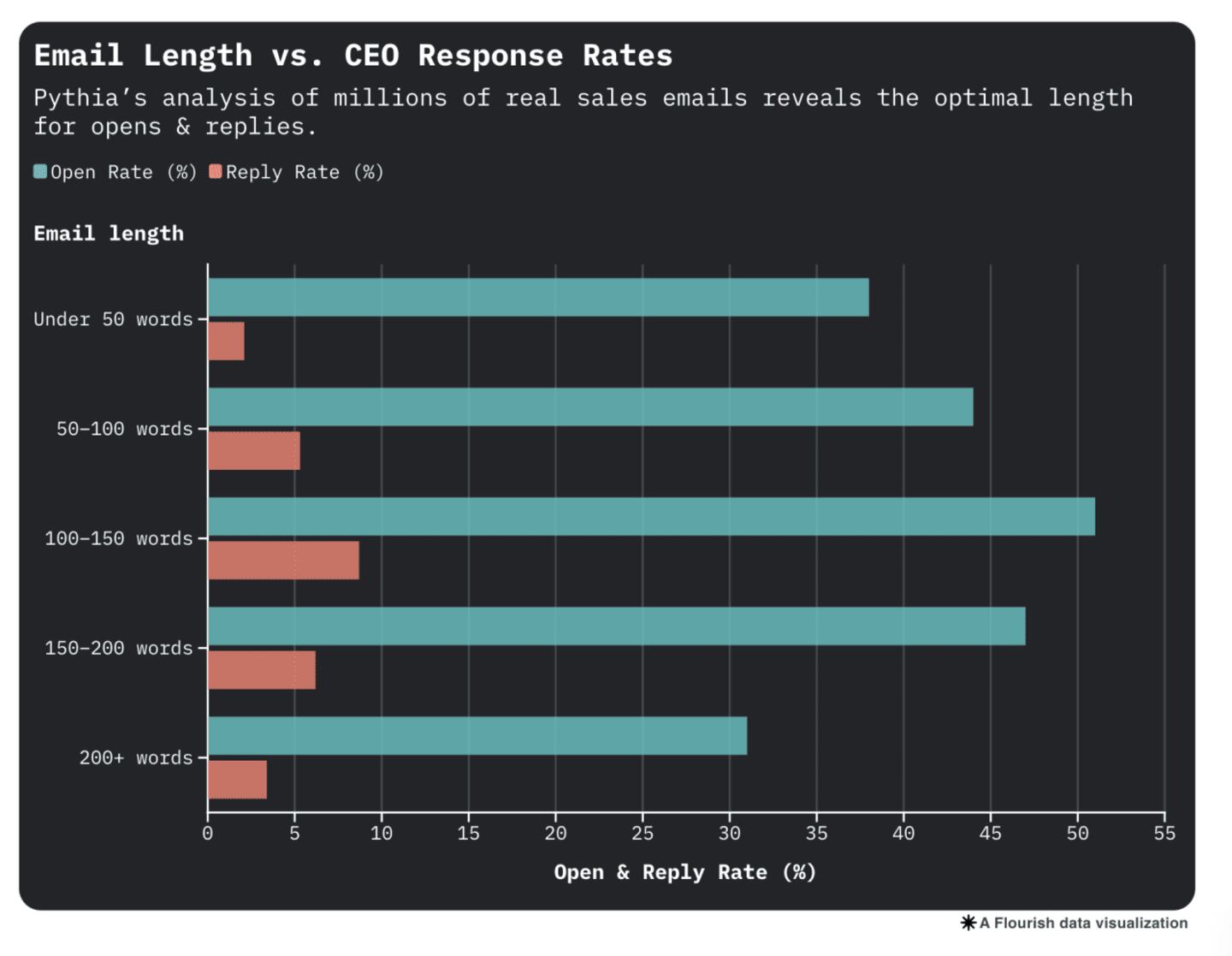 • 100–150 words: 51% Open, 8.7% Reply — Sweet spot