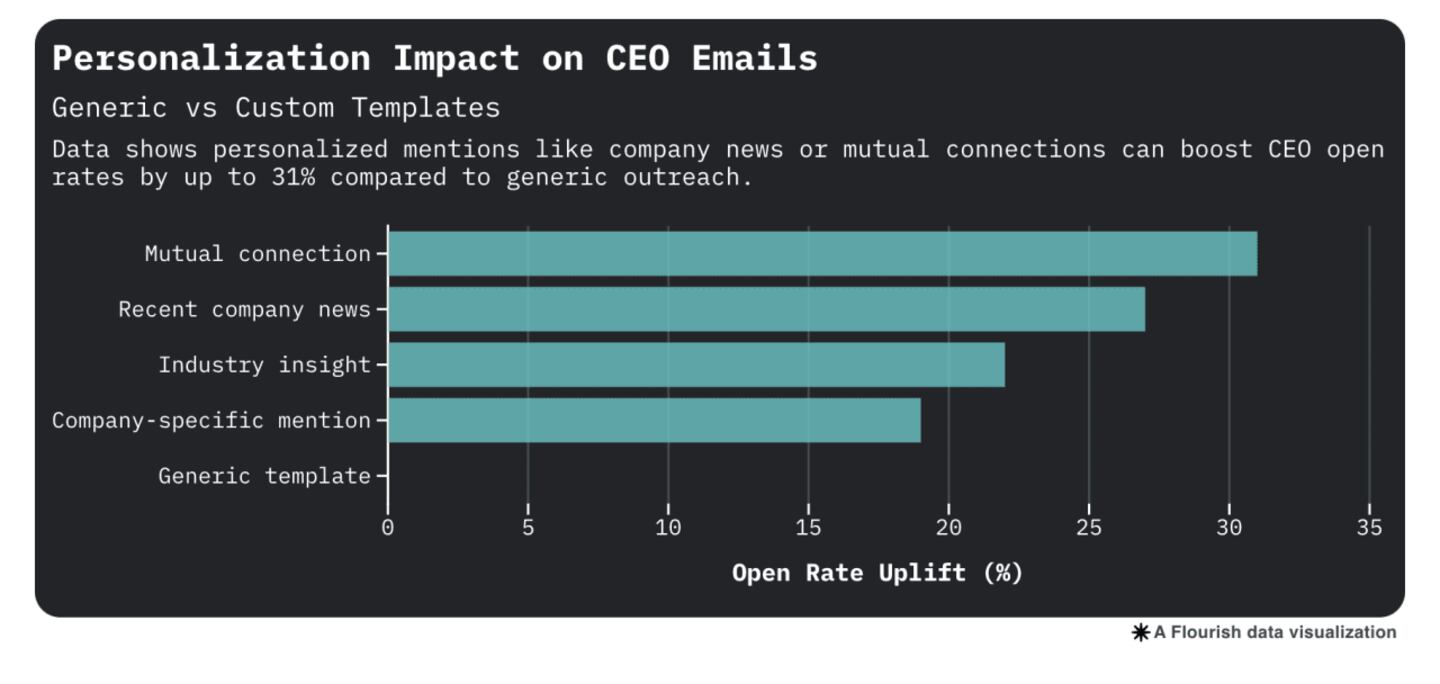 This data-backed chart shows how using personalization — like mentioning company news or a mutual connection — can increase CEO open rates by up to 31% versus generic sales emails.