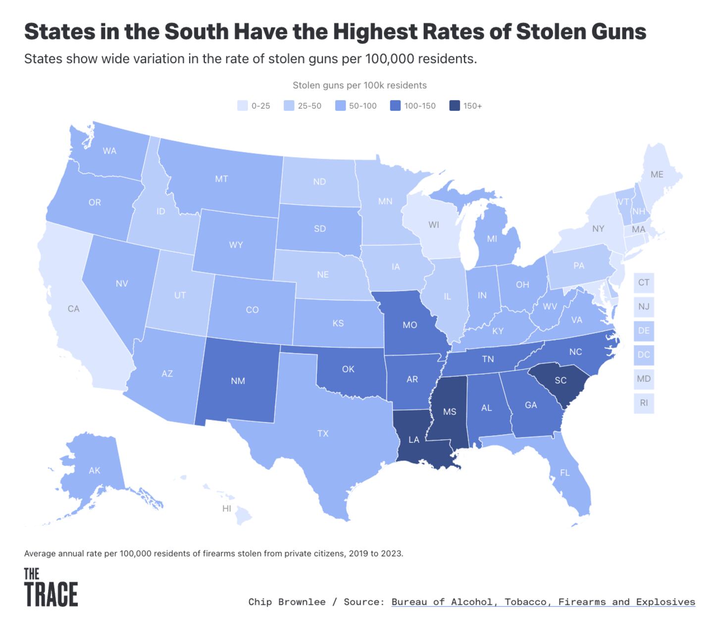 Firearms stolen from private citizens account for nearly 95 percent of all guns stolen in thefts, according to a 2025 ATF report. From 2019 to 2023, nearly 1.1 million firearms were reported stolen, and more than 1 million of those were stolen from private citizens, or roughly 200,000 annually.
