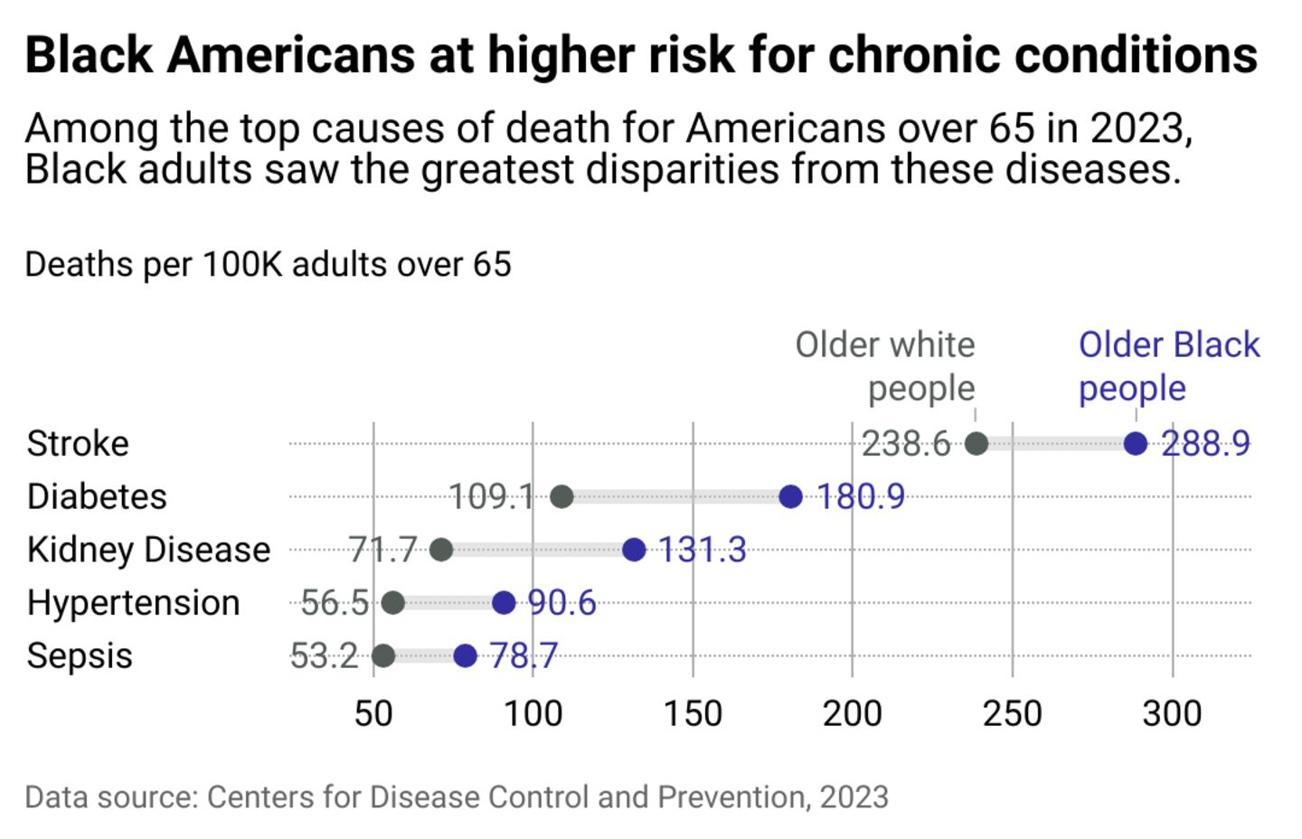 Black Americans were also 20% more likely to be diagnosed with high blood pressure and 1.4 times more likely to be diagnosed with diabetes than non-Hispanic white adults, according to 2025 data from the Department of Health and Human Services Office of Minority Health. They also tend to have worse outcomes and higher mortality rates for cancers, including lung and prostate cancer. Recent data from the CDC shows older Black populations die from stroke, diabetes, kidney disease, hypertension, and sepsis (a life-threatening reaction to an infection) at significantly higher rates than their white peers.