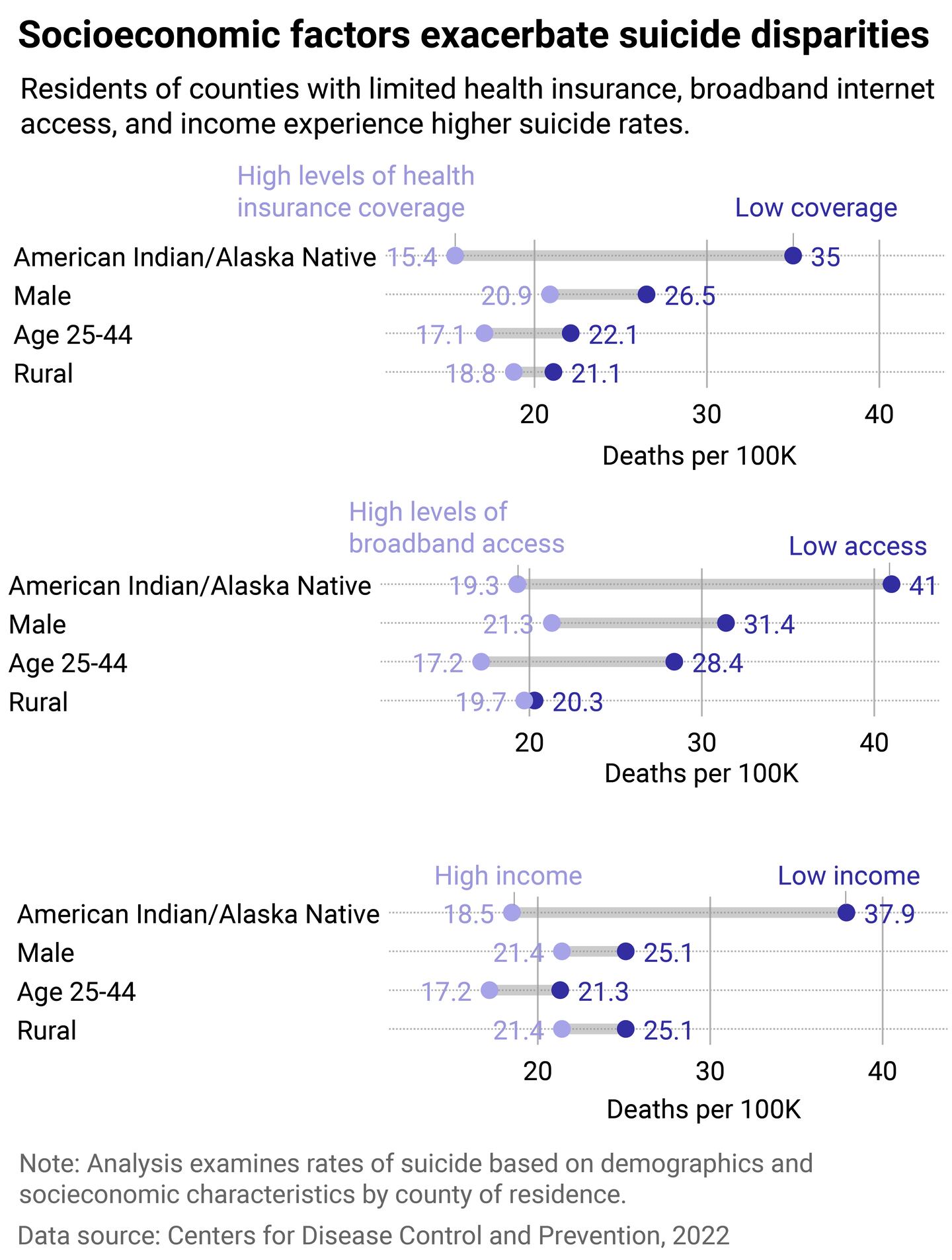 A 2024 CDC report revealed that insurance coverage, lack of access to broadband internet, and household income—systemic factors—all contribute to higher rates of suicide. Northwell Health partnered with Stacker to analyze CDC data describing the socioeconomic factors behind suicide and highlight some of the novel efforts to combat it.
