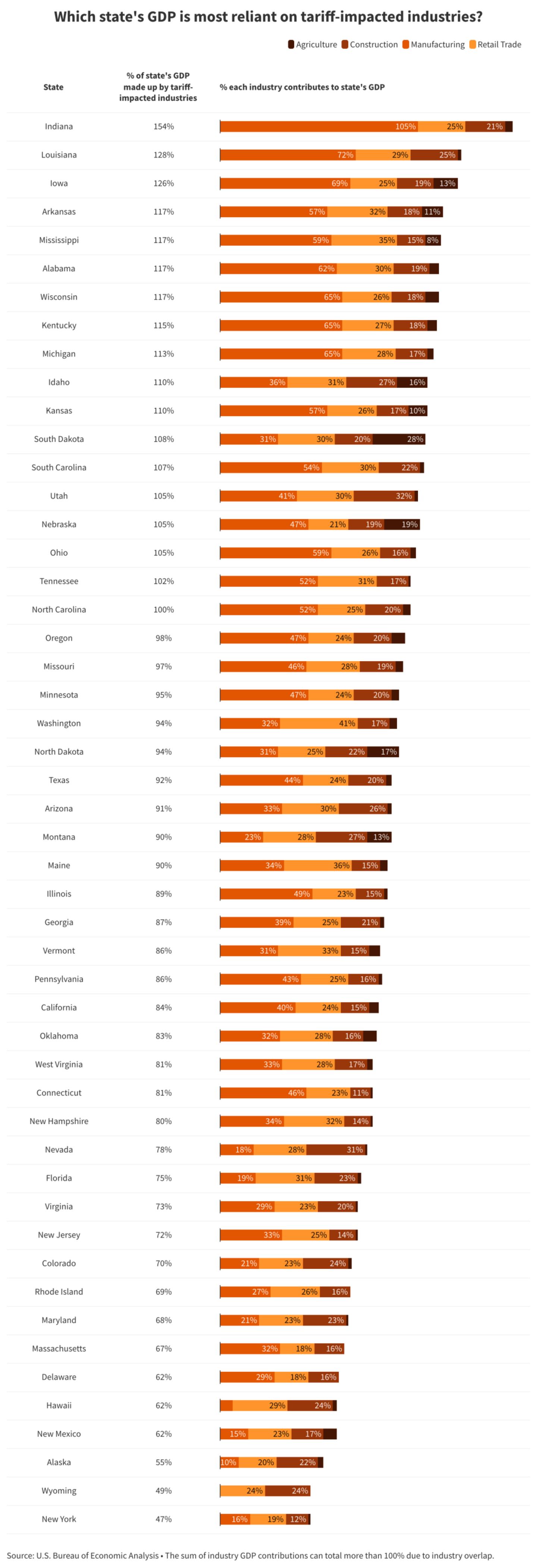 Most states lean heavily on industries hit hardest by tariffs. In 48 out of 50 states, more than half of the GDP comes from sectors like agriculture, construction, manufacturing, or retail.