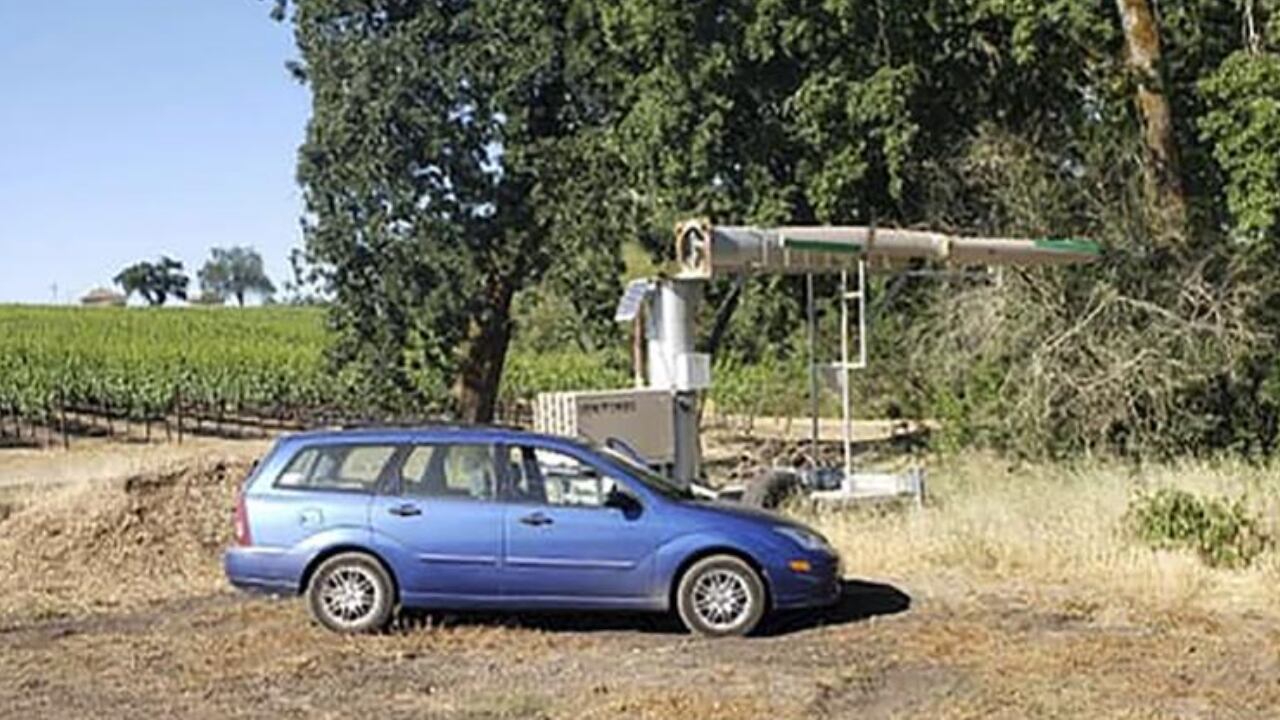 Large fans in vineyards are used to circulate air across vines to keep grapes from freezing during cooler months, according to The Associated Press.